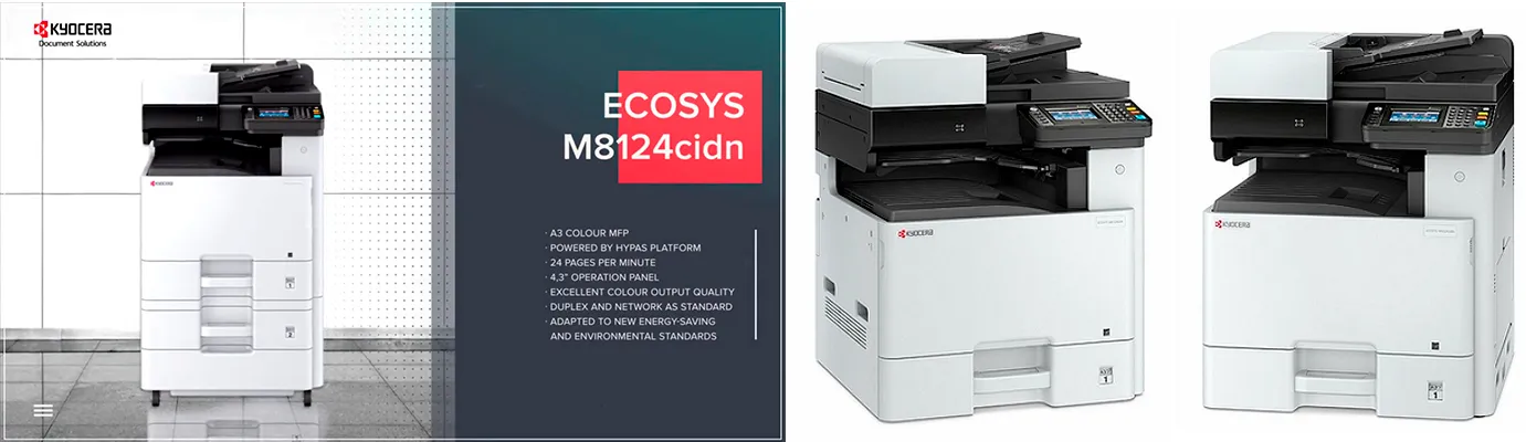 M8124cidn - цветное МФУ формата A3, новое в линейке ECOSYS, модели которой отличаются выгодной стоимостью печати, низкими эксплуатационными расходами и экологической безопасностью.