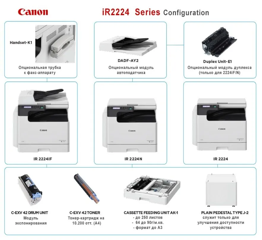В линейке доступны три машины с одинаковыми скоростями печати – 24 страниц А4 в минуту с разрешением до 1200*1200 dpi, и встроенным дуплексом (только iR 2224iF и iR 2224N). Отличия между машинами серии заключается в наличии однопроходного дуплексного автоподатчика (iR2224iF) на 50 оригиналов у старшей модели в базе (у средней модели – iR2224N возможность установки автоподатчика – опция), а также в наличии сетевых подключений – младшая версия подключается только локально через USB-2 порт. Запас бумаги для всех моделей составляет от 350 листов (в базе) и до 600 листов (с дополнительным модулем Cassette Feeding Module-AK1).