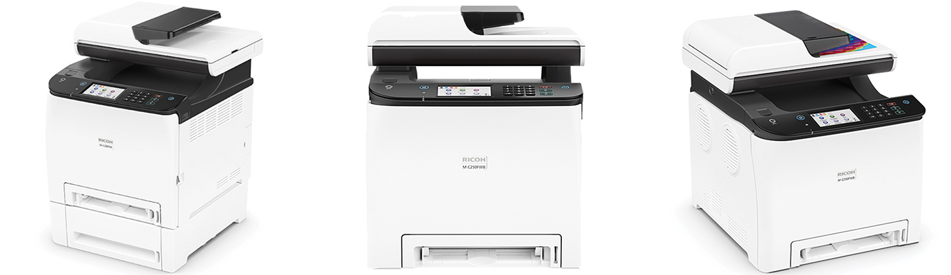 Ricoh предлагает одно- и многофункциональные версии устройств на базе эффективного механизма печати, чтобы пользователи могли выбрать модель, максимально соответствующую их требованиям. Многофункциональное устройство M C250FW 4-в-1 предусматривает функции печати, копирования, сканирования и факса. Цветная сенсорная панель управления делает работу с устройством простой и удобной, а с помощью однопроходного автоподатчика двусторонний документ можно сканировать за один проход. Установка дополнительного лотка увеличивает запас листов и позволяет загрузить бумагу разных типов и размеров.