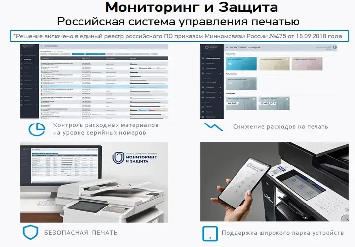 Технологии безопасности. Встроенные технологии безопасности позволяют предотвратить компрометацию данных и печати с помощью многоуровневых функций безопасности, которые защищают управление документами от различных сетевых угроз.