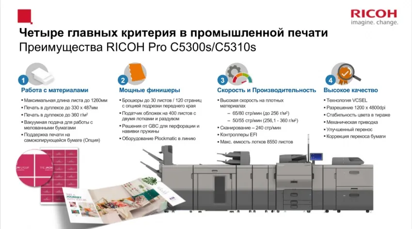 Ricoh Pro C5310S — это компактное решение с оптимальным сочетанием превосходного качества, высокой производительности, поддержки широкого ассортимента запечатываемых материалов и различных опций финишной обработки. А впечатляющая скорость печати и использование передовых технологий выгодно дополняют цифровую печатную машину, которая к тому же отличается компактным размером.
