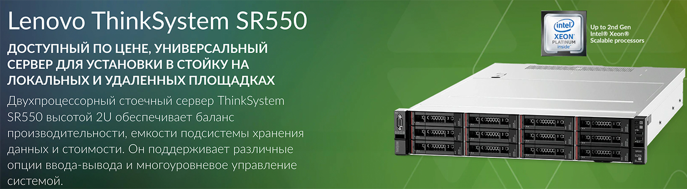 Сервер SR550 предоставляет многочисленные функциональные возможности для повышения производительности и гибкости. Он оснащен двумя процессорами семейства Intel® Xeon® Scalable, которые имеют на 43 % больше ядер, поддерживают более быструю оперативную память с тактовой частотой 2933 МГц*, более производительную подсистему ввода-вывода и увеличенную емкость подсистемы хранения данных по сравнению с предыдущим поколением. Аппаратный и программный RAIDмассивы и удобно заменяемые жесткие диски позволяют с легкостью удовлетворять потребности в хранении данных.