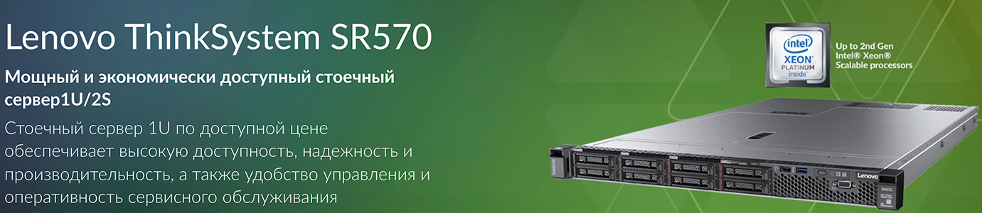 Стоечный сервер Lenovo ThinkSystem SR570 высотой 1U прекрасно подходит для обработки больших данных, поддержки веб-сайтов и горизонтального масштабирования инфраструктуры. Он предназначен для стоечных сред, где требуется большой объем оперативной памяти и производительность двухпроцессорных решений, высокая универсальность СХД, выдающаяся экономическая эффективность и удобство управления.