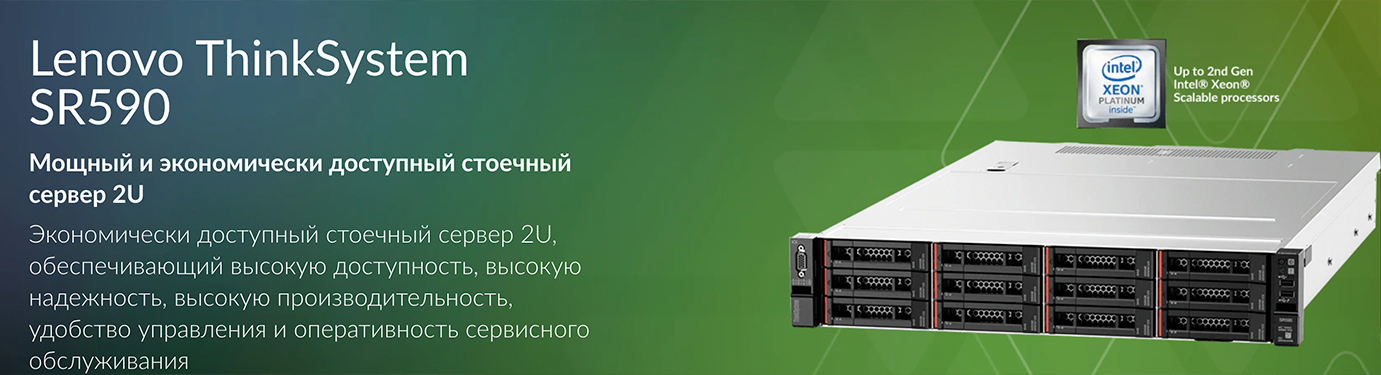 Сервер Lenovo ThinkSystem SR590 предназначен для стоечных сред, требующих производительности двухпроцессорного сервера и большого объема оперативной памяти. Он прекрасно подходит для поддержки облачных сред и обработки больших данных в средних и крупных предприятиях. SR590 представляет собой гармоничный стоечный сервер среднего ценового диапазона, подходящий для решения мелкомасштабных задач виртуализации, совместной работы и поддержки текущей деятельности предприятия. Кроме того, ему можно поручить кэширование и ведение журналов. Благодаря наличию двух процессоров семейства Intel® Xeon® Scalable второго поколения он отличается универсальностью и легко справляется с управлением тяжелыми рабочими нагрузками, которые активно используют большие объемы данных. Этому также способствует почти 1,5- кратный прирост пропускной способности оперативной памяти по сравнению с серверами предыдущего поколения. Применение модулей памяти Intel® Optane™ DC Persistent Memory в сочетании с большим объемом оперативной памяти (до 1 ТБ TruDDR4 с частотой 2933 МГц) повышает производительность и эффективность приложений, открывает перед бизнесом новые горизонты и выводит его на новый уровень эффективности при снижении общих издержек.