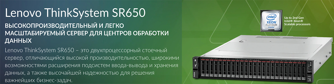 Lenovo ThinkSystem SR650 — оптимальный двухпроцессорный сервер высотой 2U, наиболее распространенный в мире. Его используют предприятия крупного и среднего бизнеса, поставщики управляемых и облачных услуг. Он разработан для обеспечения высокой производительности благодаря поддержке центральных процессоров с тепловыделением 205 Вт, накопителей NVMe с малым временем задержки и мощных графических процессоров (GPU). Учитывая репутацию решений Lenovo как самых надежных систем, сервер SR650, отличающийся высокой гибкостью и разнообразием возможных конфигураций, является идеальной платформой для гиперконвергентной инфраструктуры (HCI) или программно-определяемой системы хранения данных (SDS). Он обеспечивает надежную основу для: 1) превратить ресурсы в сервисы, используя утвержденные модели построения гибридных облаков; 2) производить анализ потоковых данных, применяя проверенные решения для работы с большими данными; 3) повысить производительность виртуализированных систем обработки транзакций, используя проверенные архитектуры построения OLTP баз данных.