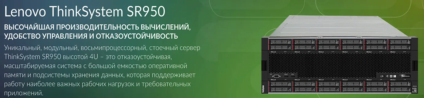 Используя увеличенную производительность процессоров, оперативной памяти, подсистем вводавывода и хранения данных, SR950 устанавливает новые рекорды быстродействия серверов стандартной архитектуры. Сервер SR950, содержащий до 8 процессоров Intel® Xeon® Platinum, поддерживает до 24 ТБ оперативной памяти и 224 процессорных ядер в стоечном корпусе высотой 4U. Благодаря этому он отлично подходит для важнейших бизнес-приложений, баз данных, работающих в оперативной памяти, и крупномасштабных аналитических рабочих нагрузок, предоставляя компактную платформу с высоким уровнем масштабируемости и доступности.