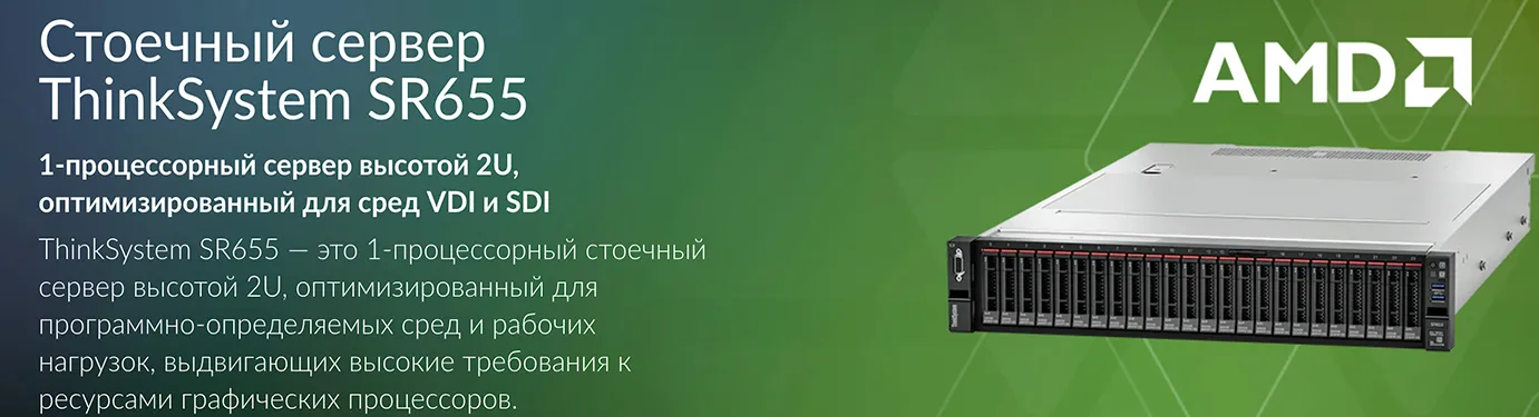 ThinkSystem SR655 — это стоечный сервер, оптимизированный для работы с несколькими графическими процессорами. Он обеспечивает поддержку до 6 графических процессоров одинарной ширины, что позволяет на 200 % ускорить выполнение рабочих нагрузок, связанных с формированием логического вывода ИИ и инфраструктурой виртуальный рабочих столов (VDI).