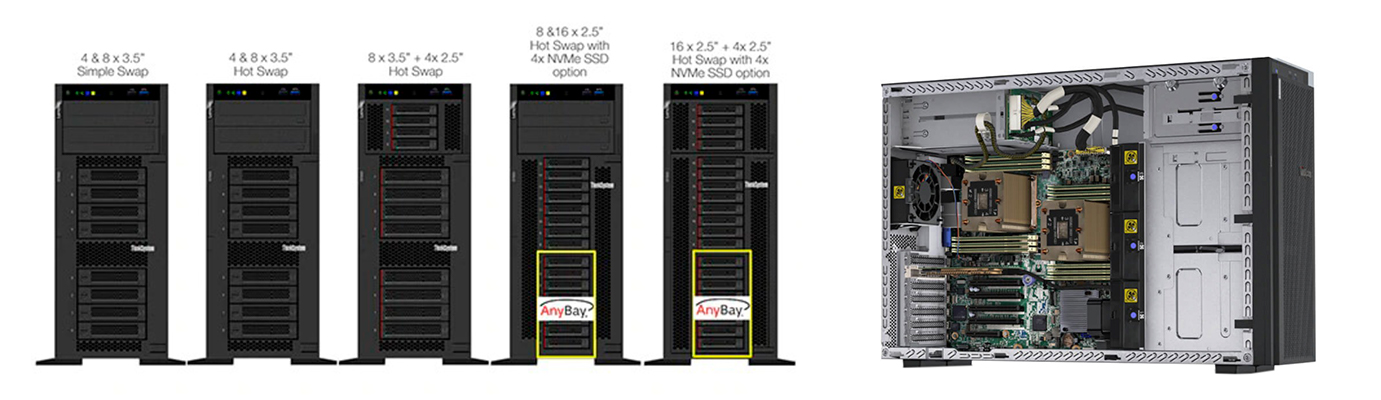 ST550 поддерживает до 96,4 ТБ емкости внутренней подсистемы хранения данных, а технология Lenovo AnyBay позволяет использовать накопители различного типа (U.2/SAS/SATA) в одних и тех же отсеках. До 6 разъемов PCIe и несколько вариантов построения аппаратных и программных RAID обеспечивают гибкость при установке сетевых адаптеров, графических процессоров и других опций расширения.