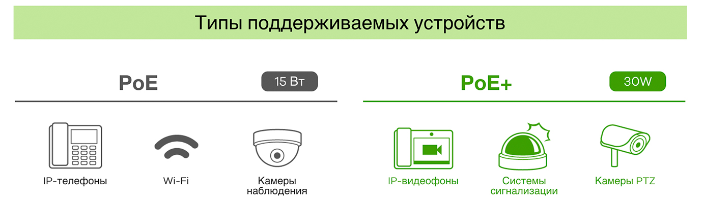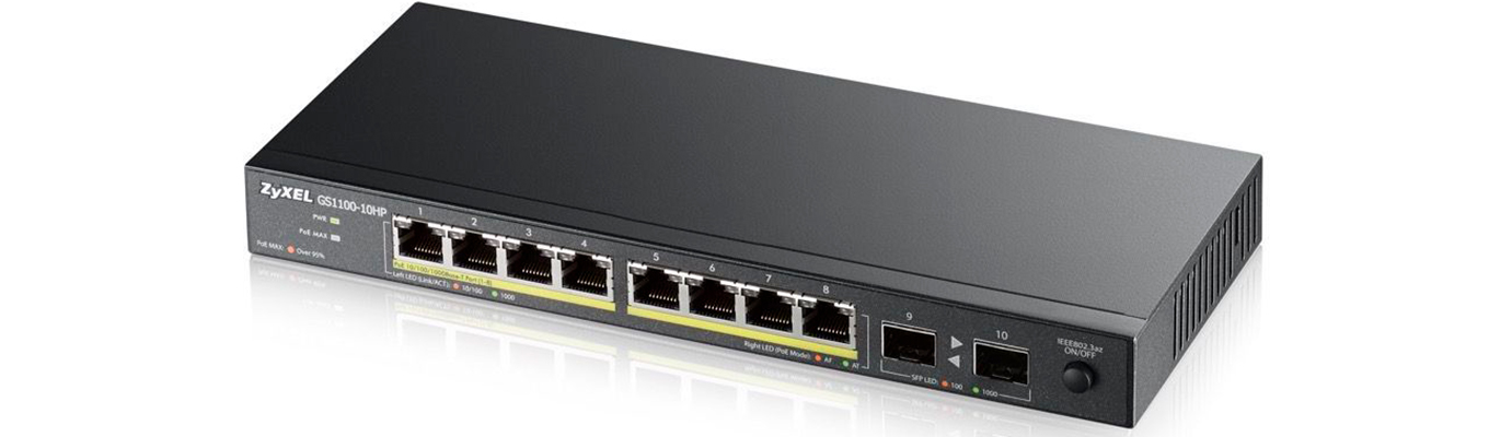 GS1100-10HP поддерживает PoE+ (IEEE 802.3at), который выдаёт максимум 30 Вт на порт, обеспечивая полностью автоматизированную поддержку питания совместимых IP-телефонов, камер видеонаблюдения или точек доступа.