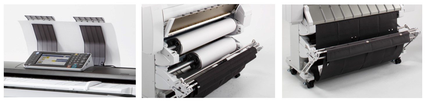Расширяемость и адаптивность. Аппарат адоптирован к различным видам работ - способен в автоматическом режиме забирать листы из вертикального лотка, возможна установка второго роля подачи бумаги, стандартно – наличие лотка выкладки для листовых материалов (до 10 листов А0/А1)