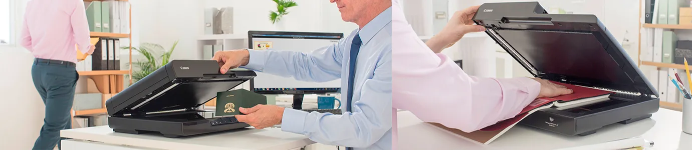 Удобная подача бумаги. Несмотря на то, что DR-F120 имеет компактный размер и занимает мало места, он позволяет сканировать широкий набор материалов. Прямой тракт подачи бумаги в устройство автоматической подачи документов позволяет загружать документы формата A4 и носители длиной до 1000 мм. Вы оцените повышенную надежность и экономия времени при сканировании смешанных документов за счет ролика отделения в механизме подачи. Модуль планшетного сканирования идеально подходит для работы с такими носителями, как книги, паспорта или журналы, и легко форматирует страницы различных форматов до стандартных размеров. Он одинаково хорошо справляется с фотографиями и другими толстыми, тонкими и очень тонкими документами.
